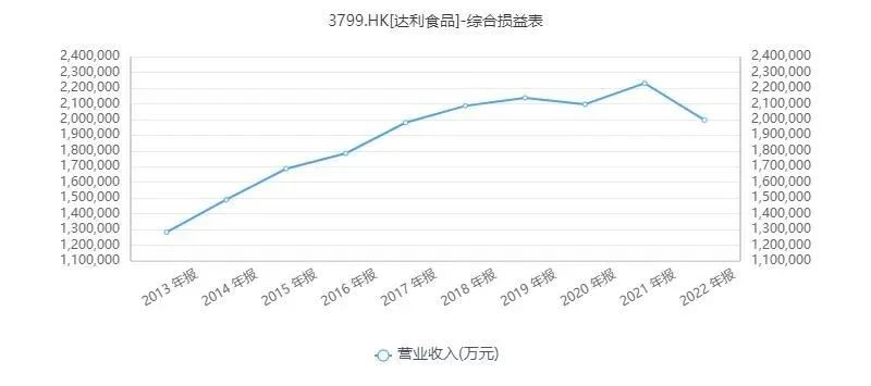 拉长时间维度,达利食品业绩起起落落,整体成长性难言多出彩,2015年营收为168.6亿元,2021年为222.9亿元。2022年则出现上市以来最大降幅,缩至199.6亿元,同比下滑10.5%。
