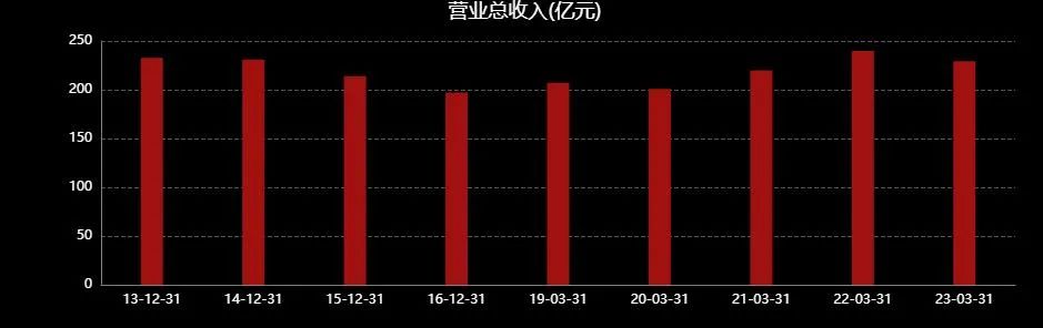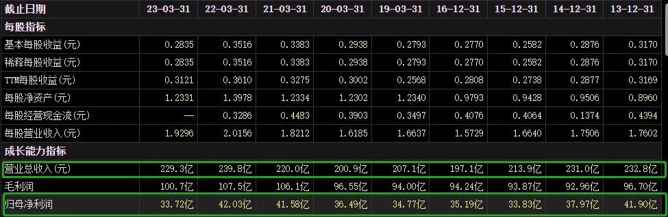 2014年-2016年,营收223.62亿元、197.87亿元、191.03亿元,净利35.20亿元、35.19亿元、33.37亿元。2017年起开始走出低谷期业绩回暖,可整体增速仍不大,即使到2021财年营收239.85亿、净利达到42.03亿均创下8年新高,相较2013年也不过是微涨。