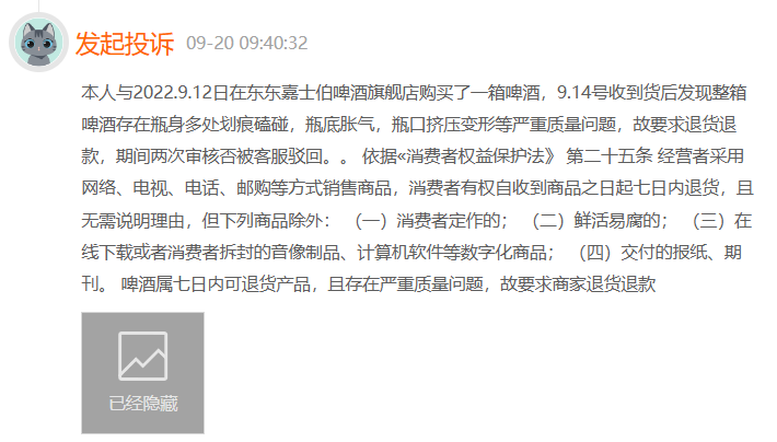 比如嘉士伯啤酒。投诉编号17361969313便显示,一消费者在京东嘉士伯啤酒旗舰店购买一箱啤酒,收货后发现整箱啤酒存在瓶身多处划痕磕碰,瓶底胀气,瓶口挤压变形等问题,与商家沟通后,嘉士伯啤酒却不予退款。