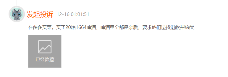 投诉编号17370437366投诉,一消费者于多多买菜购买了20箱1664啤酒,但啤酒里全都是杂质,要求退货并赔款。