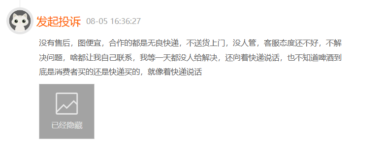除了质量瑕疵质疑,相应服务亦是诟病焦点。如投诉编号17367923528显示,线上购买的乌苏啤酒,客服态度差,没有售后,不送货上门。