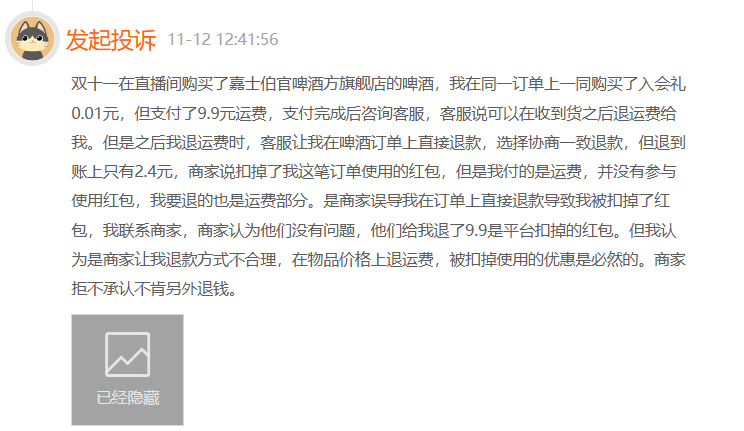投诉编号17369773544显示,一消费者双十一在直播间购买了嘉士伯官啤酒方旗舰店啤酒,其在同一订单上一同购买了入会礼0.01元,但支付9.9元运费,支付完成后咨询客服,客服说可以在收到货之后退运费给他。但之后退运费时,客服让其在啤酒订单上直接退款,选择协商一致退款,退到账上只有2.4元。