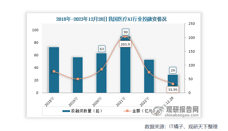 据IT橘子网站数据显示,2019年-2021年,我国医疗AI行业相关投资事件数呈现增长趋势;2021年-2023年12月28日,相关投资事件数逐年递减。其中,2021年医疗AI行业投融资数量和已披露金额为近6年来最高,分别为90起和203.9亿元。而截至2023年12月28日,今年(2023年)医疗AI行业相关投资事件量仅29起,已披露金额仅31.95亿元。