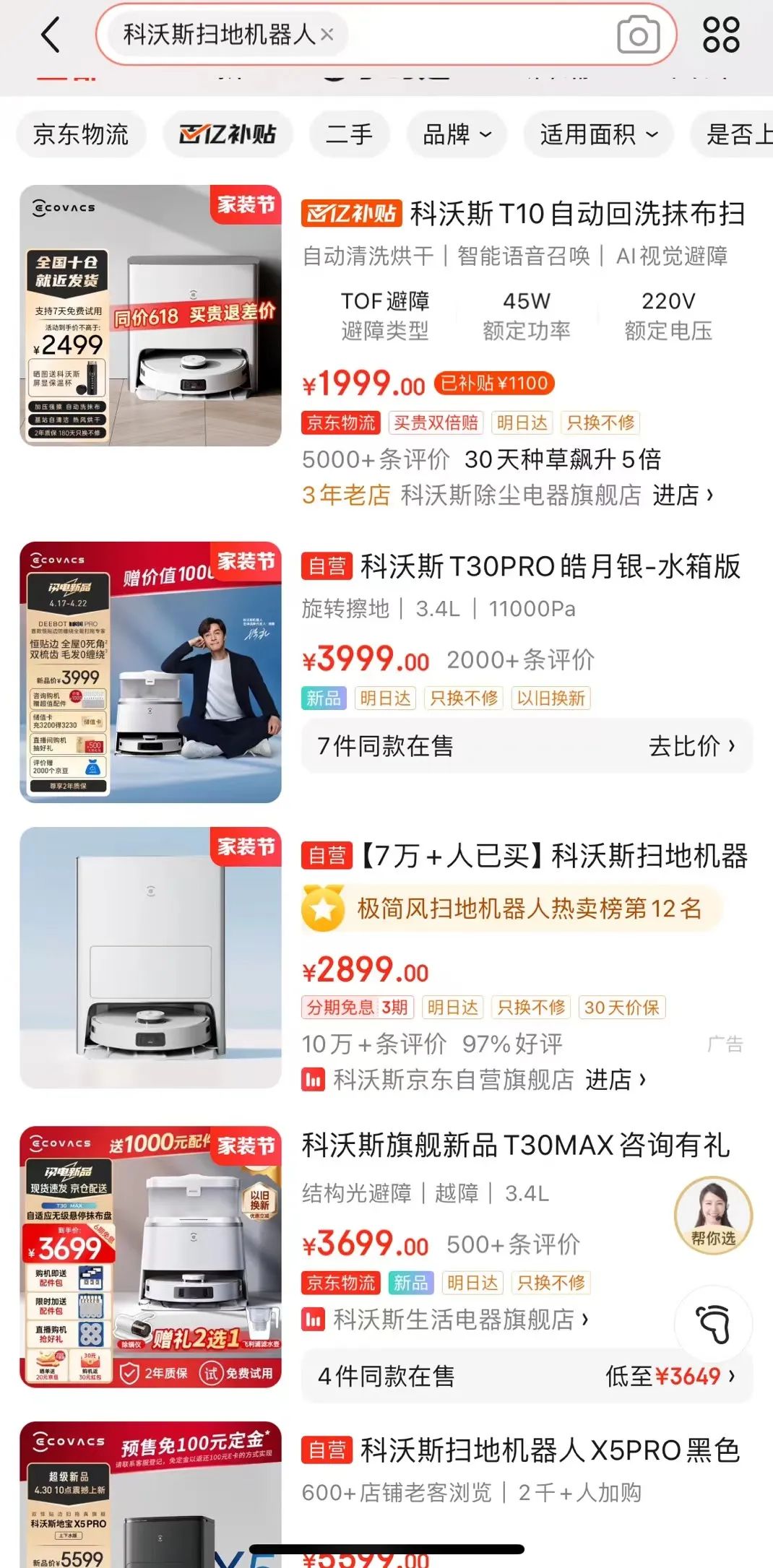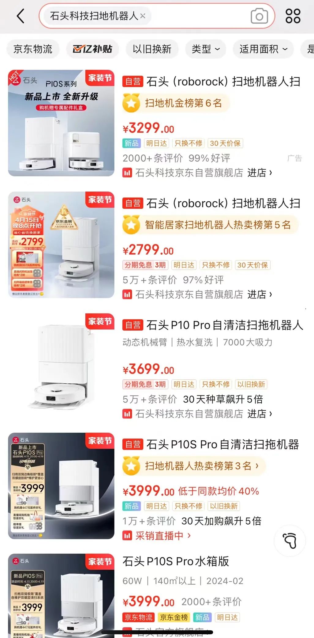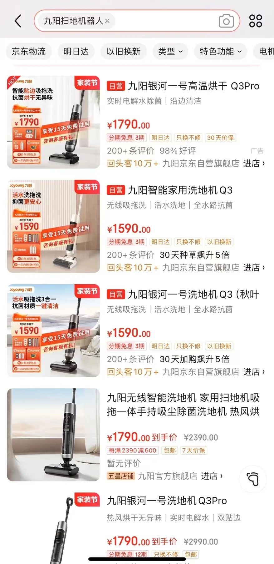 浏览2023财报,并没将“清洁电器”系列的收入单独列出,以其为关键词搜索,也没检索出相关内容。浏览京东商城,以九阳扫地机器人为例,展现的店铺分别有200+人、300+人付款。而搜索石头科技扫地机器人和科沃斯扫地机器人,展现的店铺付款人数有8000+人、2万+人、5万+人付款等。