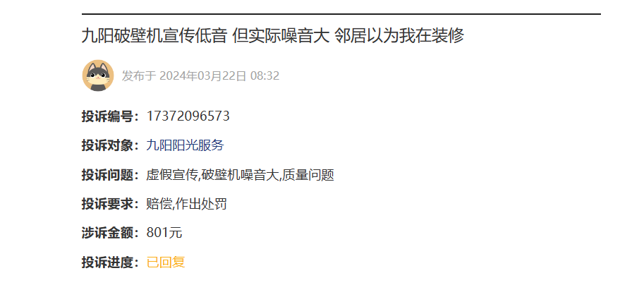 例如3月22日,投诉编号17372096573显示,一消费者称,购买九阳的破壁机时,宣传上写的是低音,但用了几次之后,遭到邻居投诉,说我大早上在装修,我仔细听了之后,确实声音很大,可以说是噪音了,比一般的豆浆机声音都大,并未达到宣传上所谓的低音效果,咨询客服,客服说这是打豆子的正常声音,破壁机在客厅,我在卧室关的门都能听见很大的声音,怪不得邻居投诉我......