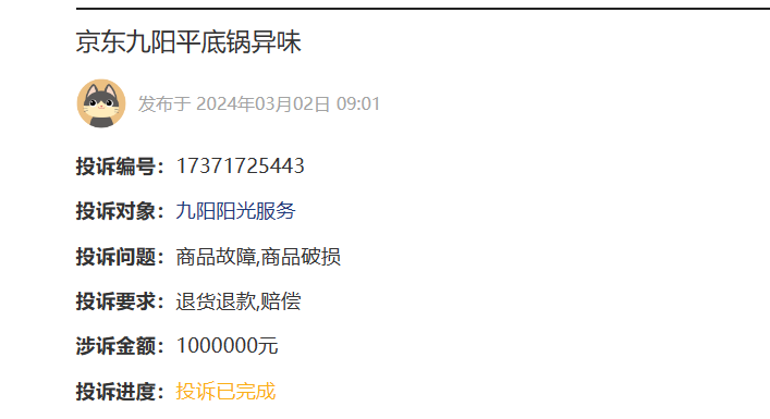 再如投诉编号17371725443显示,一消费者称在京东九阳旗舰店买了一个平底锅,每次用都有一股很奇怪的化学物质味,本来以为是新锅就没在意,后面每次用都有,联系客服不给退货退款。
