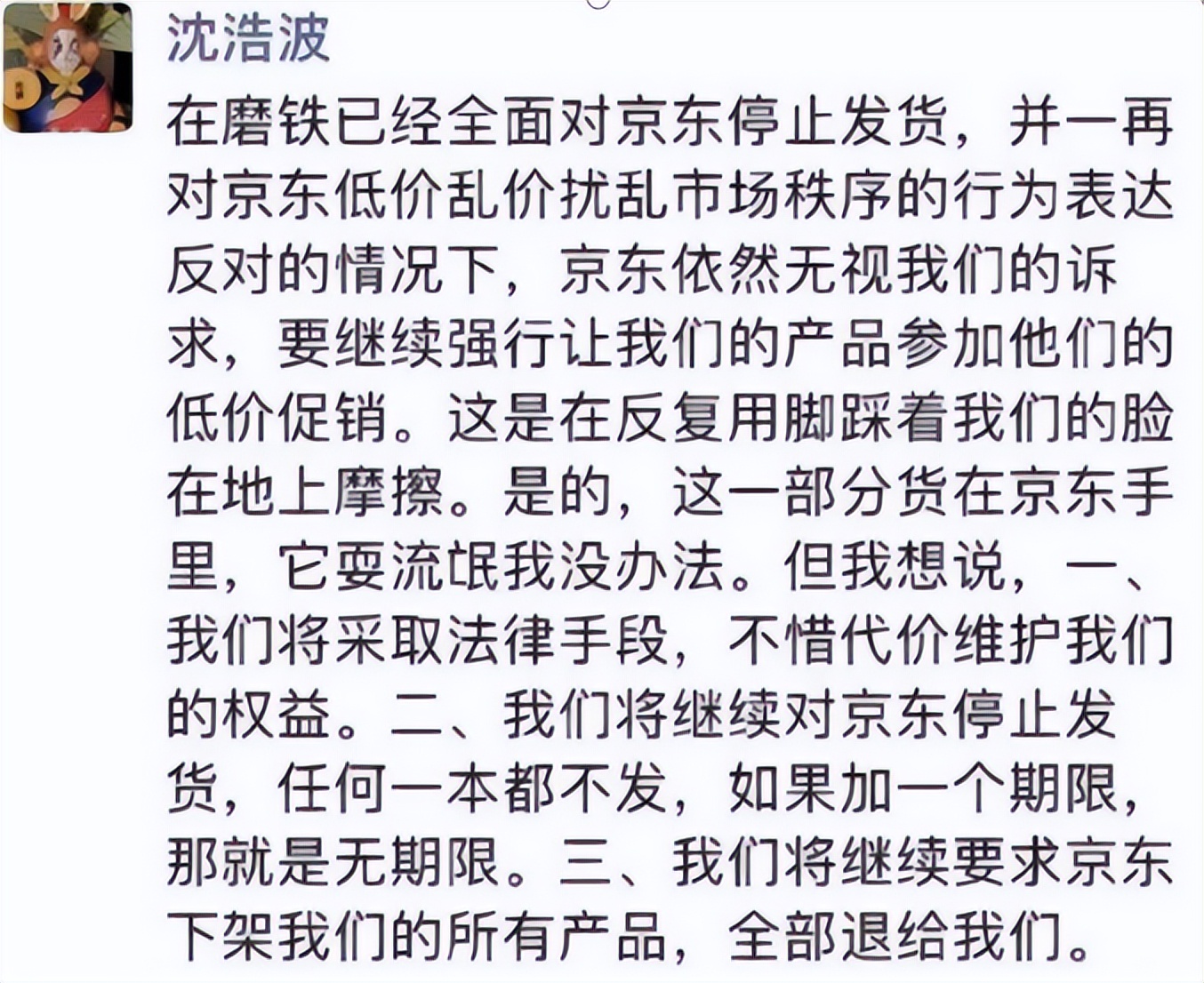5月31日,磨铁集团创始人、CEO沈浩波一则朋友圈爆料引发各方关注:在磨铁已经全面对京东停止发货,并一再对京东低价乱价扰乱市场秩序的行为表达反对的情况下,京东依然无视诉求,要继续强行让我们的产品参加他们的低价促销.......