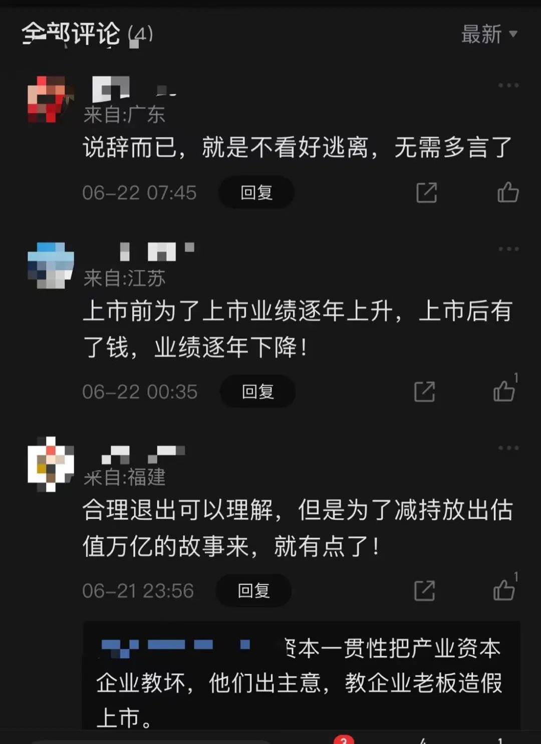 话虽如此,浏览东财、雪球等互动平台,一些投资者似乎仍有疑虑,“说辞而已,就是不看好逃离,无需多言了”、“上市前为了上市业绩逐年上升,上市后有了钱,业绩逐年下降!”、“它不是看好的吗?这么低还急着跑,也是够了”、“利空出尽这是”……