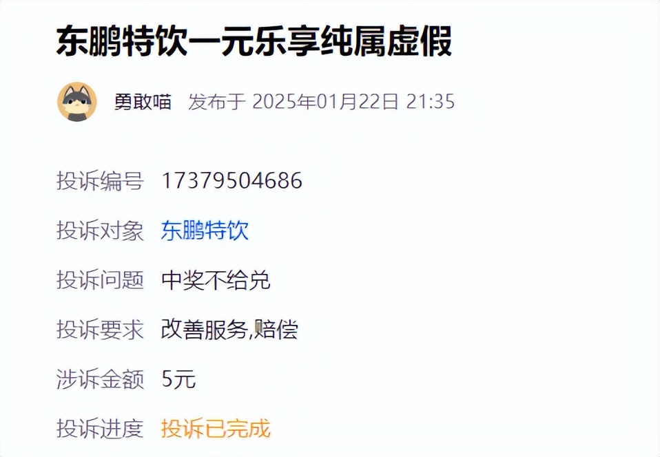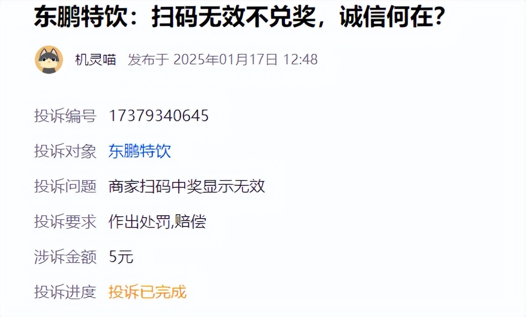 如平台过审投诉编号17379340645显示,一消费者表示,自己购买东鹏特饮中了1元乐享奖,但兑奖时,商家扫码显示无效不兑奖。