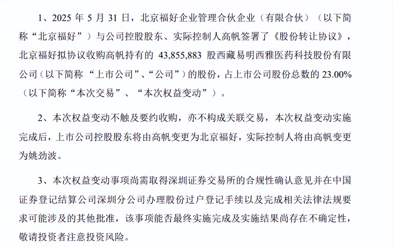 2025年6月3日晚,易明医药公告称,5月31日北京福好与公司控股股东、实控人高帆签署《股份转让协议》,前者拟协议收购高帆持有的43855883股易明医药股份,占上市公司股份总数的23%。此次权益变动实施完成后,公司控股股东将由高帆变更为北京福好,实控人由高帆变更为姚劲波。