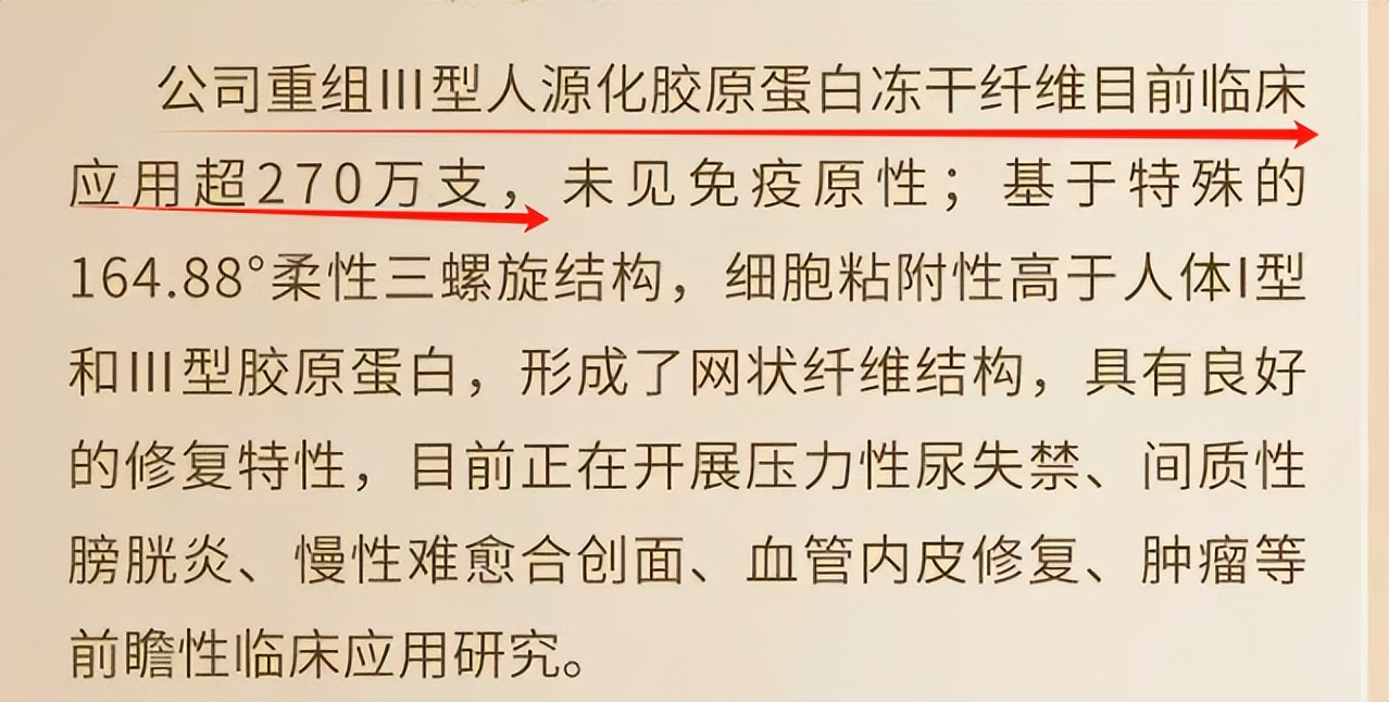 2021年6月,公司自研的三类医疗器械“重组Ⅲ型人源化胶原蛋白冻干纤维”获国家药监局批准上市,为国内自研的首个采用新型生物材料——重组人源化胶原蛋白制备的医疗器械。对应品牌薇旖美®,是全球首个可用于注射的重组人源化胶原蛋白产品。
