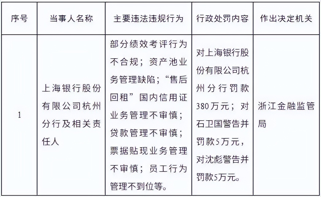 8月4日,因部分绩效考评行为不合规、贷款管理不审慎等6项违法违规行为,上海银行杭州分行被罚380万元。