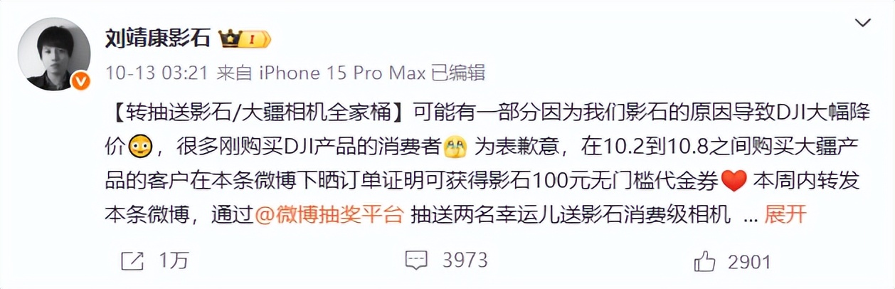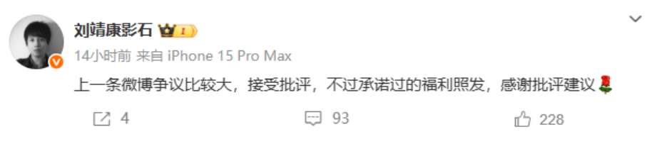 10月13日,因上条微博争议较大,@刘靖康影石发文接受批评、感谢建议,不过承诺过的福利照发。