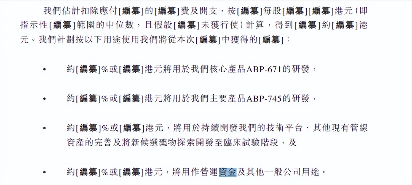 聚集此次募资,将分别用于核心产品ABP-671、ABP-745的研发,以及开发公司的技术平台、其他现有管线资产的完善及将新候选药物探索开发至临床试验阶段,和用作营运资金及其他一般公司用途。
