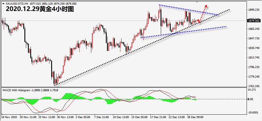 12月28日,美国国会针对没人派发2000美元的提案进行表决,并获得通过。签约了一项全面的新冠纾困法案,这结束了与国会的僵局,避免政府停摆,并为数百万美国人在新冠疫情席卷全国之际获得经济援助铺平了道路。需要注意的是,快要收年线了,二次形成V型反转概率较高,这段时间尽量减少交易。技术面上,黄金上方1900-1910区间较强压力,日线上收录上影阴K,金价仍处于日线移动平均线粘合收窄形态,仍处于偏震荡趋势影响。