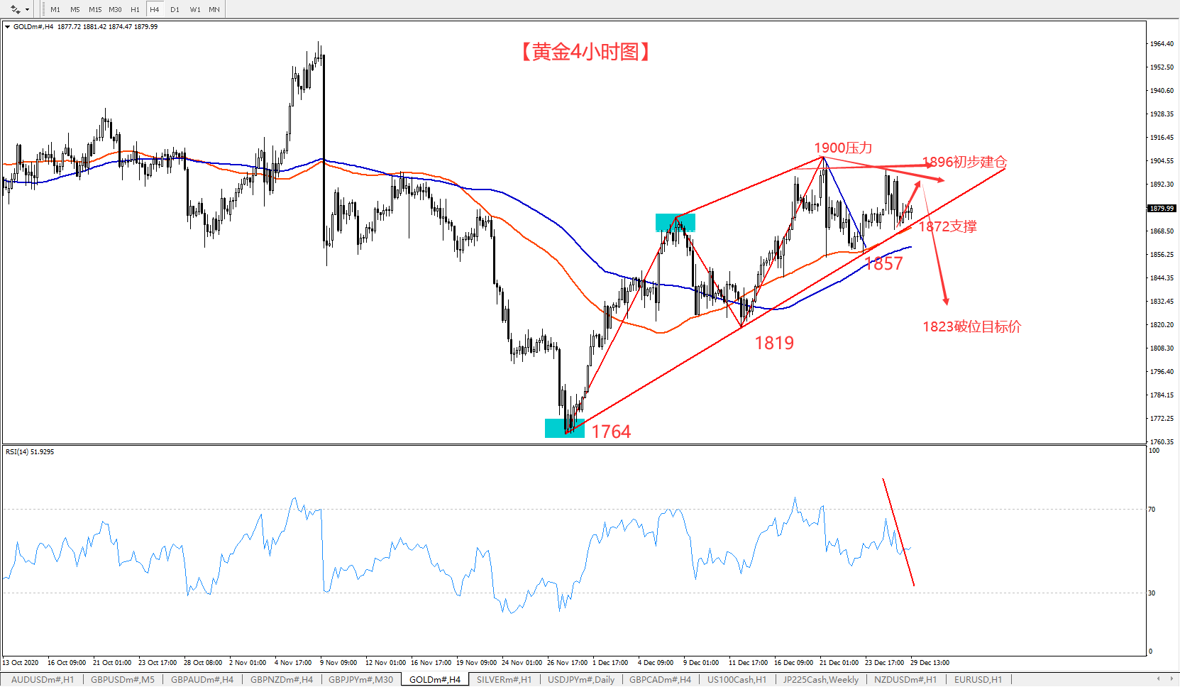 首先,先从4小时的结构图中来看,黄金并没有向下跌破来自1764-1819-1857的上行结构趋势,但是呢,上方的高点,先后从1906下移至1900点,又给黄金的多头施加了一定的压力,这也是为什么说黄金在上一个交易日当中,没有冲高的原因,目前依旧处在高位进行区间整理。