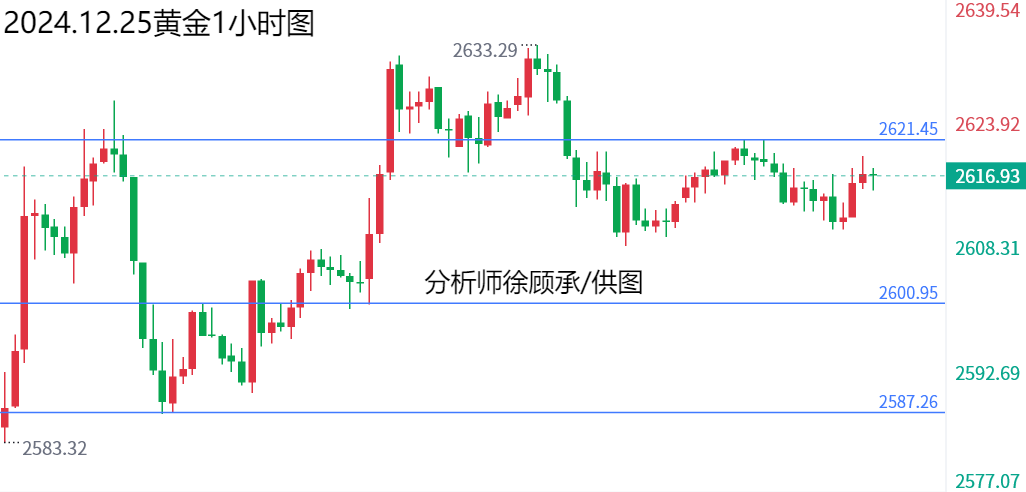 周三(12月25日)黄金市场因为圣诞节假期休市;金价周二在假日清淡的交易中持稳,大家对美联储的利率策略和特朗普的关税政策进行了展望,这些的不确定可能会影响黄金明年的走势。现货黄金周二窄幅震荡,收盘上涨0.16%,收报2616.74美元/盎司,当天振幅仅11.36美元。