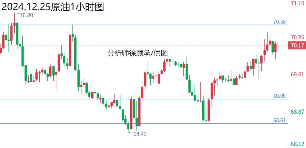 原油:明年原油价格暴跌的风险比原油价格飙升的风险要大得多,可能会在短期内提高原油基准,但随着企业习惯了这种影响,导致价格下跌,加拿大和墨西哥可能被迫更积极地转移其出口。而美国的石油产量可能会大幅增加,美国和加拿大的页岩油产量也可能会出现合理增长,原油四小时级别上看,油价走势在区间内震荡波动,整体为一个斜率不大的宽幅下行通道。原油短线客观趋势维持震荡不变。多空的动能反复交替,力度相当。预计日内原油仍维持在通达区间内震荡为主。综合以上分析,原油依旧处于宽幅震荡中,明天操作上徐顾承建议考虑高空低多策略,上方关注70.6-71.5美元阻力,下方关注69.3-68.5支撑。