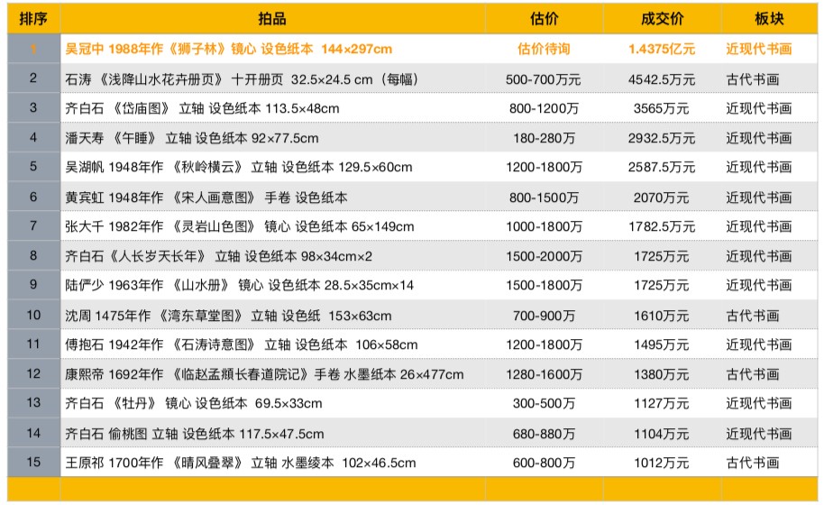 在刚刚结束的中国嘉德拍卖大观之夜拍卖中,近现代书画与古代书画共计104件标的,最终实现7.312亿元总成交,两场平均成交率达80%,吴冠中1.4375亿《狮子林》领衔,再次刷新了其水墨画的最高价纪录,以及2019年春拍近现代书画最高价纪录。高价拍品方面,另有14件超过千万元成交的拍品。