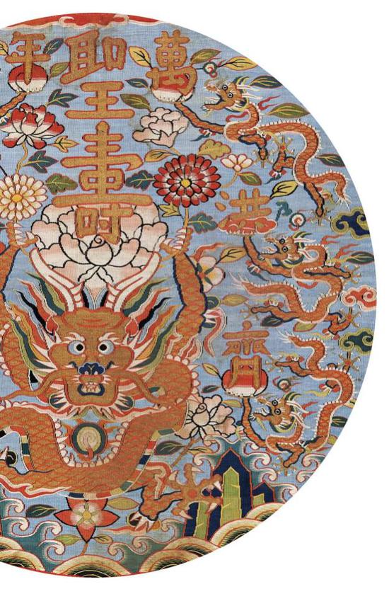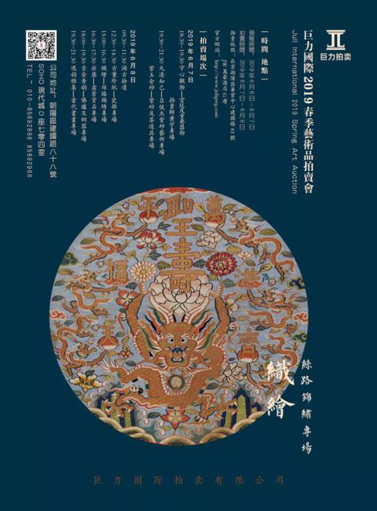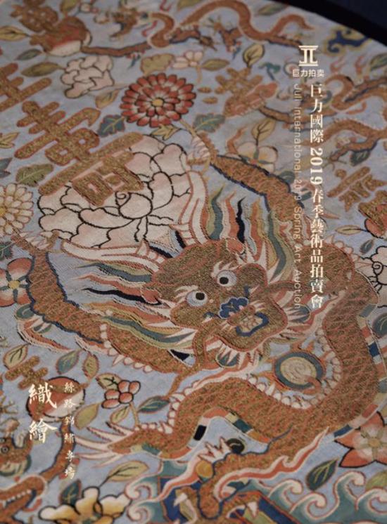 除此之外,巨力国际拍卖《圣寿万年 洪福齐天》图通体缂丝,七条金龙、八个金字、江崖海水、寿桃花卉错落有致地表现其中。图上大型金龙两只后爪外张,紧抓左右江崖,江崖之间海水翻腾,海水之上涌出花卉一朵。两只前爪上举,各自擎出花枝一株,花枝之上开有牡丹和菊花。头顶大簇的茶花一朵,茶花之上用金线缂出“圣寿”二字。金龙两侧,左右各又缂出体型稍小的金龙三条,或捧寿桃,或托祥云寿桃,祥云之上亦用金线缂出稍小的“万年洪福齐天”数字,与大龙头顶的“圣寿”二字正好组成“圣寿万年、洪福齐天”,寓意吉祥且简单明了,堪称顶级罕见的旷世珍品,1840万元的成交价也证明了它历史、文化与艺术相交织的高度价值。