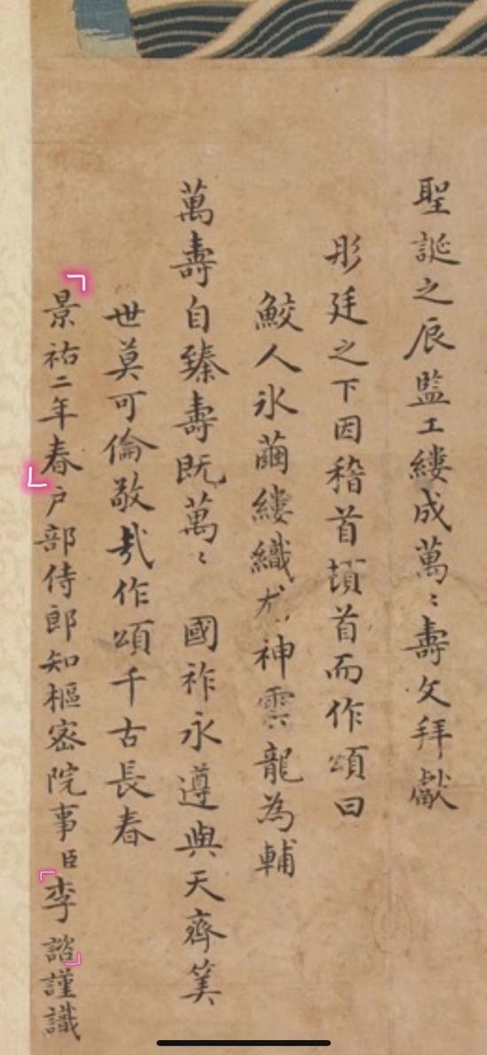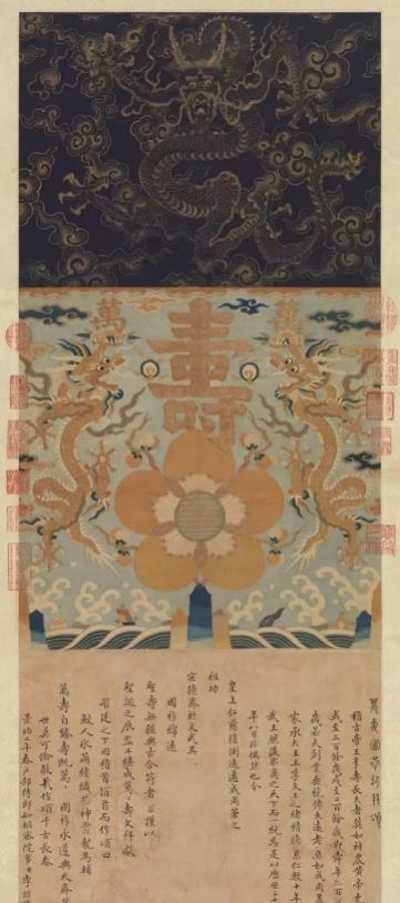 万寿图恭记并颂——稽,古帝王享寿长久者,莫如神农、黄帝、尧、舜,或至三百余岁或至二百余岁即舜年一百有十岁,若夫创业、垂统,传久远者,莫如成周盖周,家承大王王季、文王之绪,积德累仁数十年,至武王然后取商之天下,而一统为是以历世三十历年八百非偶然也。今,皇上仁慈恺恻,远迈成周,兼之祖功宗德,齐于文武,其国祚绵远、圣寿无疆,与古今符者,臣谨以圣诞之辰,监工缕成万万寿文拜献彤庭之下,因稽首顷首而作颂曰:鲛人冰茧,缕织尤神,云龙为辅,万寿自臻,寿既万万,国祚永遵,与天齐筭,世莫可伦,敬哉作颂,千古长春。景祐二年春,户部侍郎、知枢密院事臣李咨谨识。
