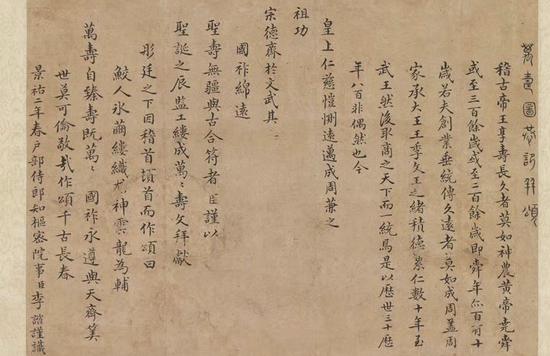 此篇颂文大致的意思为:在宋代景佑二年春,正值宋仁宗25岁圣寿,户部侍郎、知枢密院事臣李咨,借缂丝《万寿图》向皇上祝寿,称“根据历史考证,古代帝王长寿的就是神农、黄帝、尧、舜,善于治国的仁德皇帝就是周王季、周文王、周武王祖孙历代。如今,我们的皇上(景祐宋仁宗)也是心怀天下,德行、功绩齐于周文王、周武王。臣在皇上生日之际,监工织成这幅万寿图,祝福皇上万寿,国运与天同岁。”