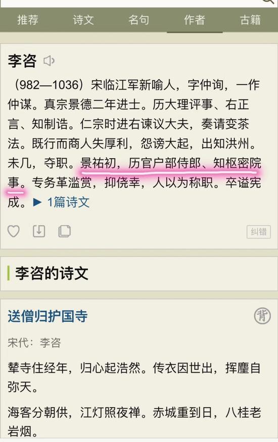 而李咨是景佑初年,历官户部侍郎、知枢密院事。