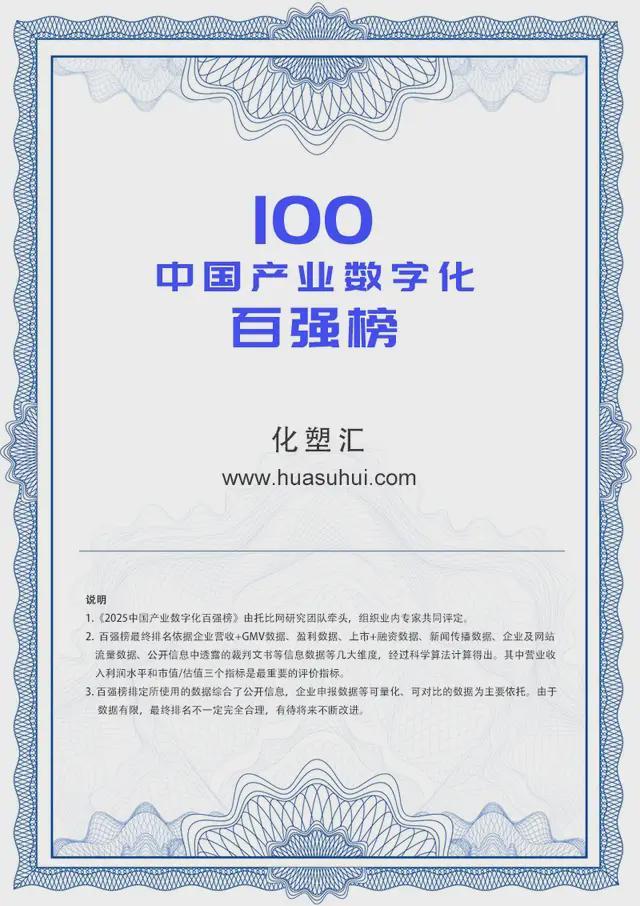 9月23日,由南京市鼓楼区人民政府主办,托比网、产业数字化创新发展联盟承办的第十二届中国产业数字化大会在南京举行。大会聚焦AI、出海、数智供应链三大主题,共探新时代产业数字化发展机遇与挑战。化塑汇凭借在产业数字化领域的深度实践与显著成效,荣登“2025中国产业数字化百强榜”。