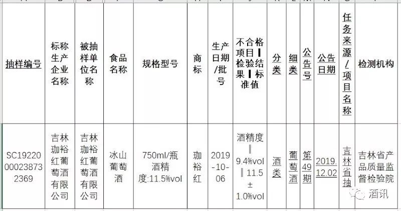 在卯足信心发展中国优质山葡萄冰酒的同时,其产品表现却不容乐观。12月初,吉林省市场监督管理厅网站发布的一则通告(2019年第49期)显示,专项抽检中,酒类不合格1批次。标称吉林珈裕红葡萄酒有限公司生产的冰山葡萄酒(750ml/瓶、酒精度:11.5%vol、珈裕红商标),酒精度不符合产品明示质量要求,检验机构为吉林省产品质量监督检验院。
