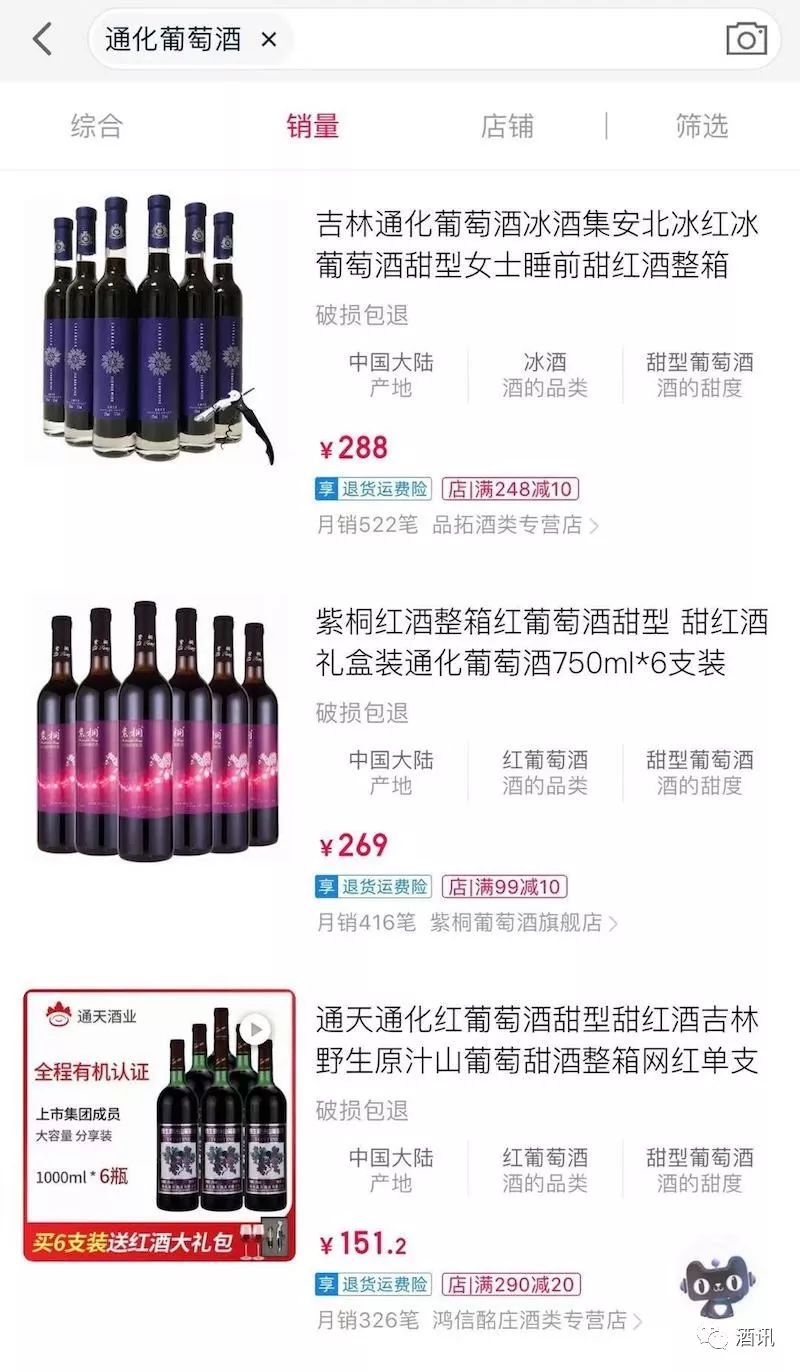 酒讯在天猫以“通化葡萄酒”为关键词,按销量排序,排在第一位的是288/箱(6瓶)的集安北冰红甜型冰葡萄酒,销量为522笔。而在百度旗下的B2B垂直搜索引擎百度爱采购上搜索价格则从12~30元不等。