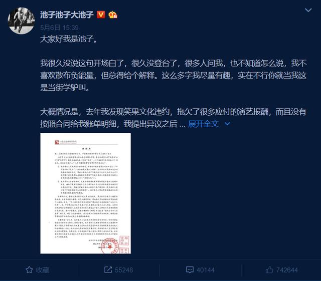 5月6日,微博认证为“喜剧表演者”的用户“池子池子大池子”发布长文称,自己是池子,2019年笑果文化违约,拖欠了很多应付的演艺报酬,而且没有按照合同向其提供账单明细。在其提出异议之后,笑果基本上刻意停止了其一切工作。