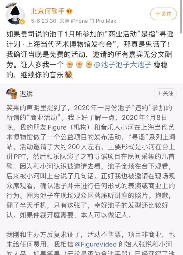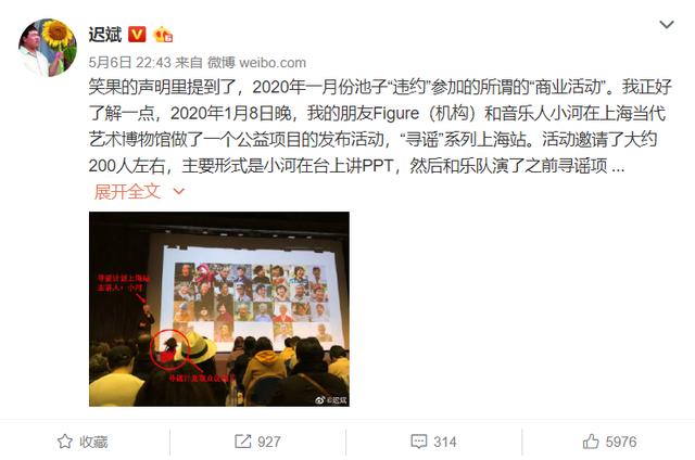针对笑果文化提到1月份池子未经允许擅自参加商业活动一事,活动参与者迟斌5月6日22:43发布长文称,笑果的声明里提到2020年一月份池子"违约"参加的所谓的"商业活动",是2020年1月8日晚,Figure(机构)和音乐人小河在上海当代艺术博物馆做了一个公益项目的发布活动,"寻谣"系列上海站。