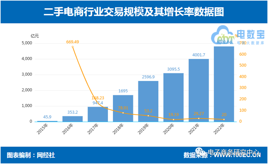 另据“电数宝”电商大数据库显示,2022年二手电商交易规模达4802.04亿元,同比增长20%。