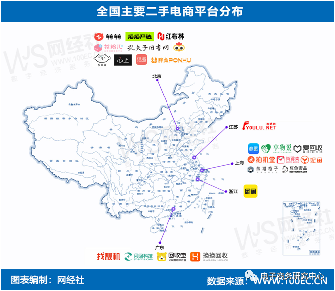 从地区分布来看,北京地区二手电商主要有转转、拍拍严选、红布林、花粉儿、孔夫子旧书网、阅邻、多抓鱼、心上、胖虎;浙江地区有闲鱼;上海地区有鲸置、享物说、爱回收、拍机堂、有得卖、熊猫格子、妃鱼、豆鱼奢品;广东地区有找靓机、闪回收、回收宝、换换回收;江苏地区有有路网等。