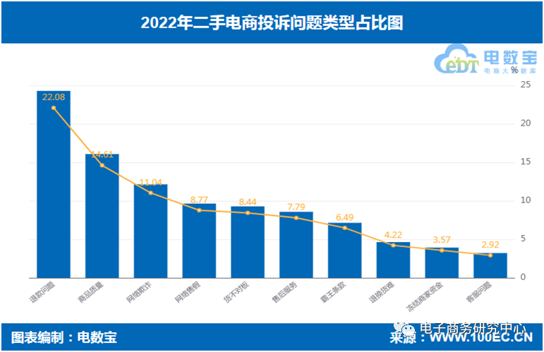 “电诉宝”受理用户维权案例显示,退款问题、商品质量、网络欺诈、网络售假、货不对板、售后服务、霸王条款、退换货难、冻结商家资金、客服问题等是2022年二手电商投诉的主要问题。