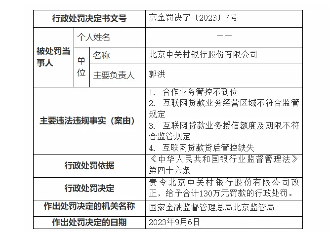 互联网贷款业务多个环节存问题,中关村银行被罚130万