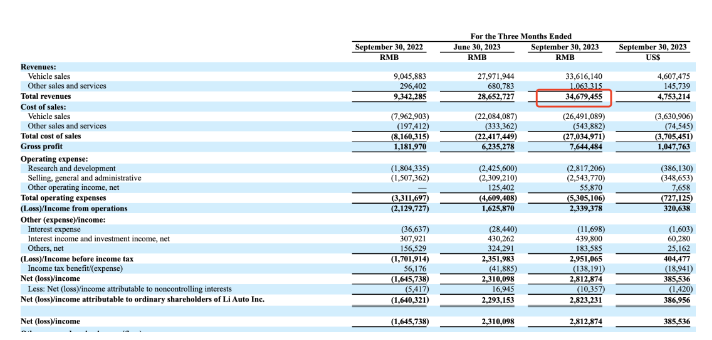 业绩方面,11月9日晚,理想汽车发布2023年第三季度财报,季度营收、交付量等方面均创下历史新高。数据显示,理想汽车当期实现营收346.8亿元,同比增长271.2%。净利润为28.1亿元,去年同期则为净亏损16.5亿元,这已经是理想汽车连续第四个季度实现盈利。