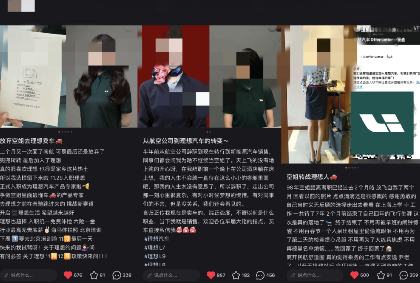 从发文标题来看,几乎都是“放弃空姐理想去卖车,空姐转战理想人,从航空公司到理想汽车的转变”。有博主称,结束了多年的飞行生涯,不用再被早班闹钟惊醒,不用再被黑名单烦恼,不用再因为大练兵焦虑……最终加入了有挑战的理想汽车团队。