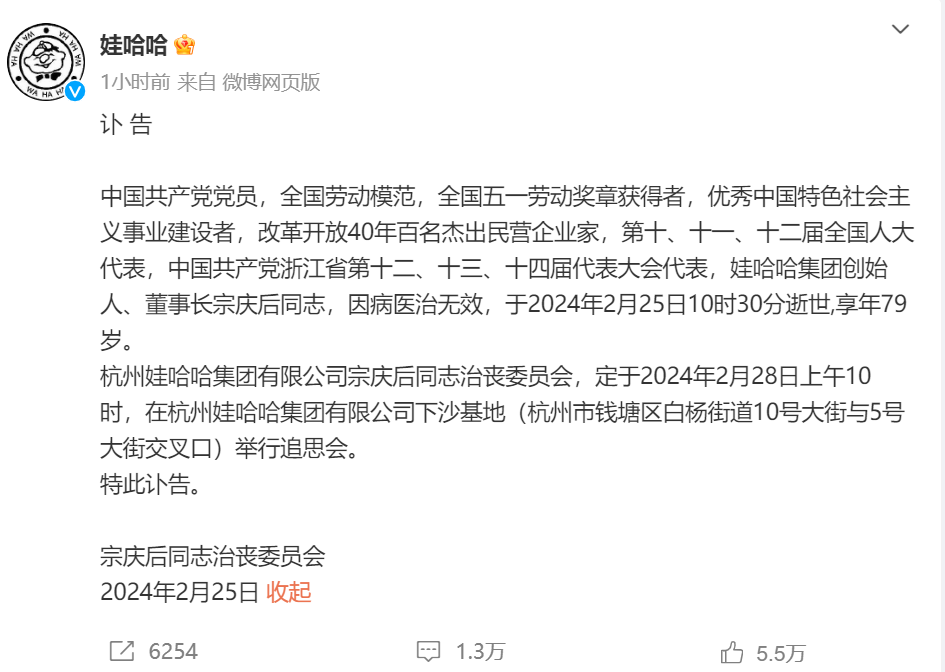 2024年2月25日10时30分杰出民营企业家、娃哈哈集团创始人、董事长宗庆后因病医治无效逝世,享年79岁。