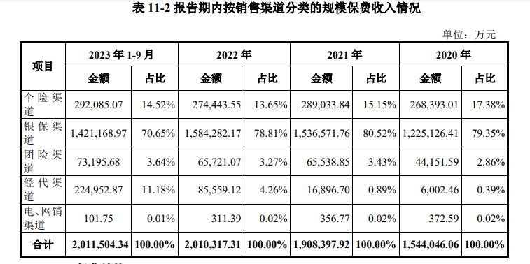 高占比趸交业务,主要来自于银保渠道。利安人寿以往对银保渠道存在较高依赖度,2020年、2021年保费规模占比分别达到79.35%、80.52%,主动压降下,银保渠道保费规模在2023年前3季度下滑至70.65%,经代渠道则有明显拓展,保费占比从2020年的0.39%提升至去年前3季度的11.18%。整体看来,银保渠道规模占比仍然较高。
