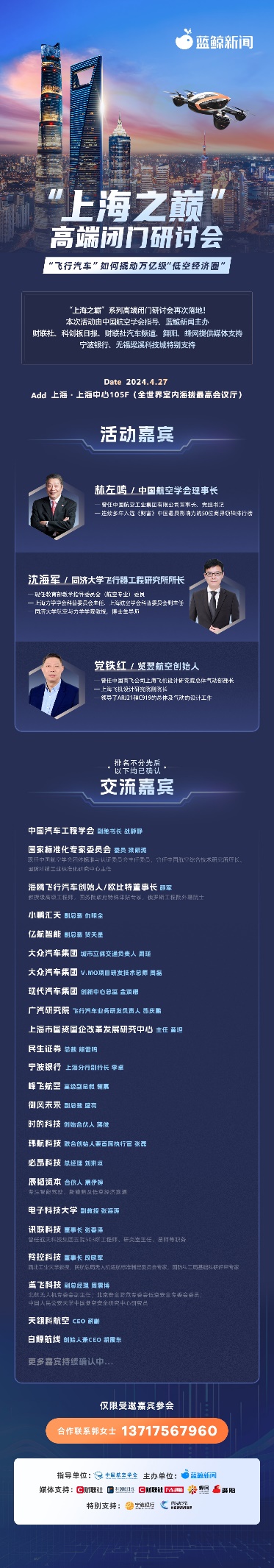 本次“上海之巅”蓝鲸飞行汽车高端闭门会由中国航空学会指导,蓝鲸新闻主办,财联社、科创板日报、财联社汽车频道、蜂网、舞阳提供媒体支持,宁波银行、无锡梁溪科技城特别支持。