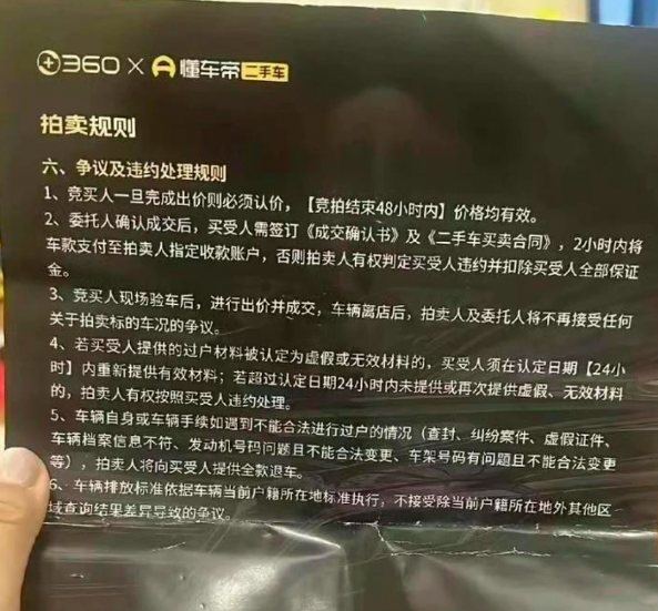 据现场二手车商发布的拍卖规则显示,竞买人一旦完成出价则必须认价,竞拍结束48小时内价格均有效。委托人确认成交后,买受人需签订《成交确认书》及《二手车买卖合同》,2小时内将车款支付至拍卖人指定收款账户,否则拍卖人有权判定买受人违约并扣除买受人全部保证金。