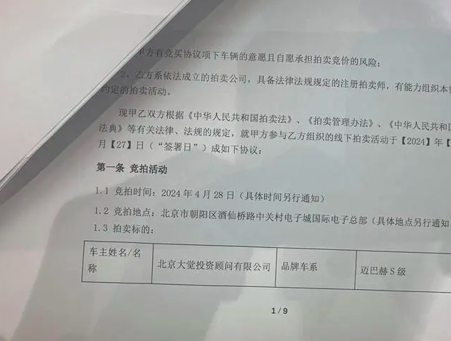 据第一财经报道,有参与拍卖活动的二手车商提供的文件信息以及最终签约合同页面显示,拍卖标的车主姓名即为“北京大觉投资顾问有限公司”。
