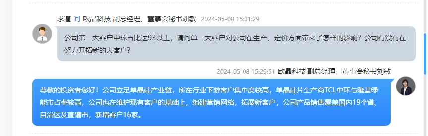 在5月8日举行的2023年度业绩会上,就相关提问,欧晶科技副总经理、董事会秘书刘敏回应称,“硅片生产商TCL中环与隆基绿能市占率较高,公司也在维护现有客户的基础上,组建营销网络,拓展新客户,新增客户16家”,目前与TCL中环、阿特斯、双良节能、青海高景、安徽阜兴等大中型单晶硅片生产商建立了长期、稳定的合作关系。