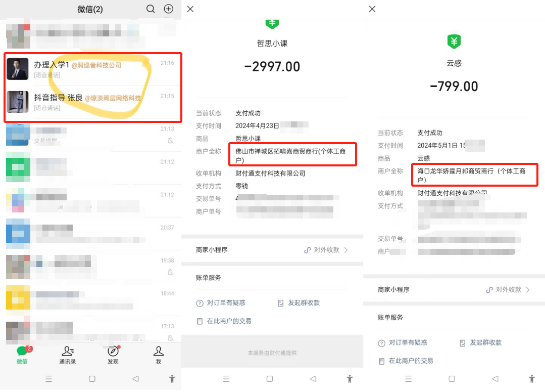 这类诈骗案例多以“0元公开课”为饵诱导学员上钩,挂着官方的头衔在私域完成所有操作。指导老师的企微所属、前后两次付款二维码对应的商户都是不同的主体,其中许多显示经营异常、0人参保,且它们分散在全国各地、成立时间不长。