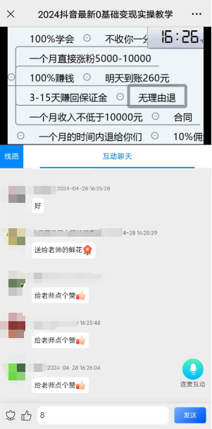 这些收益包括且不限于:一个月涨粉5000-10000、今天报名明天就能到账260、一个月收入不低于10000元。只闻其声不见其人的金牌导师向学员们展示了他的账户余额,讲述了学员赚钱后辞职做自媒体的经历,并再三强调课程限额10人。