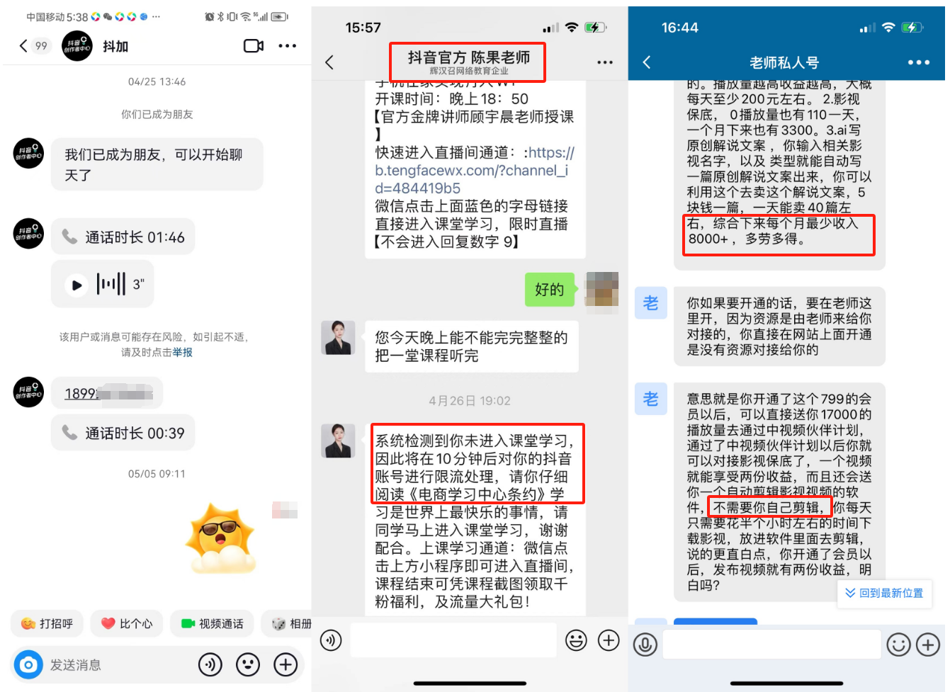 和筱绿相比,兰兰更像是被暗中盯上的。她甚至没有刷到过剪辑课、变现课推广,只是连续看了几场素人宝妈的直播。一个名为“抖加”的帐号就主动关注、私信并致电了兰兰,表示有免费的官方直播课可以听。起初兰兰也不信所以没听课,直到对面的“官方指导老师”发来一段略带恐吓的话语:系统检测到你未进入课堂学习,因此将在10分钟后对你的抖音帐号进行限流处理。