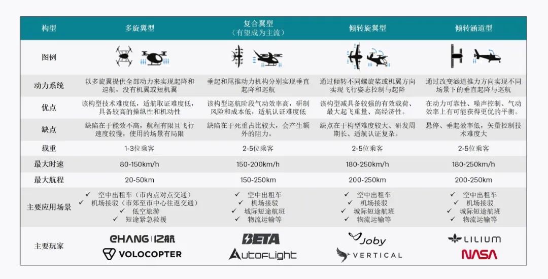 以构型为例,这背后代表了不同的技术路线。目前来看,eVTOL主要有四种具体构型:多旋翼、复合翼,以及倾转旋翼、涵道构型等,彼此之间各有优劣。