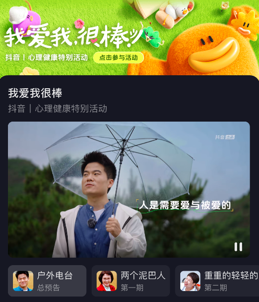 该节目名为《我爱我,很棒》,由抖音官方自制,董宇辉在节目中作为主持人与嘉宾们对话,向观众呈现不同的人物经历。从6月7日到6月9日,节目共播出了三期,平均每期在15分钟以内,访谈的嘉宾分别为心理咨询师完颜慧德、癌症妈妈邓静、房车妈妈苏敏。