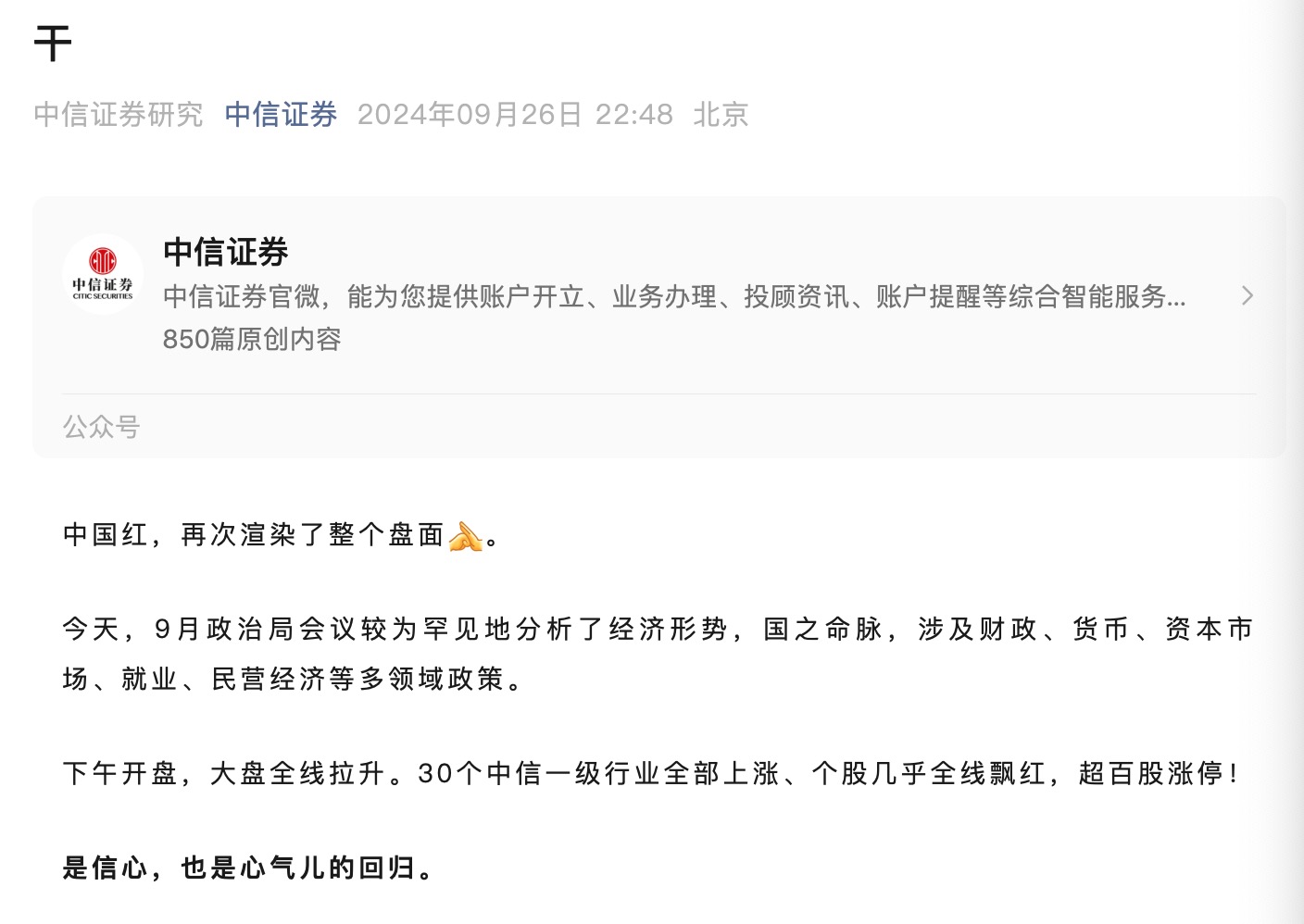 蓝鲸新闻9月26日讯 超预期政策带来的市场情绪持续发酵。记者注意到,今日晚间,中信证券研究在公司官号发布文章,标题仅一个字:干。